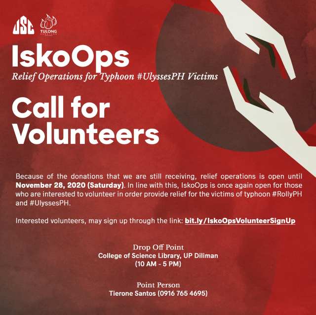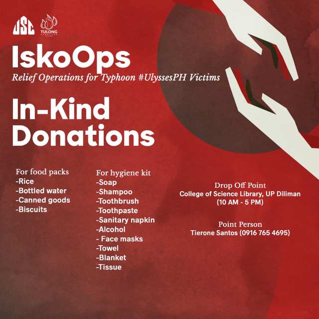 An initiative of the UP Community, Isko-Ops continuously unites organizations and members of the University of the Philippines in responding to the needs not only of their members but other kababayans as well. They have already extended their help to the victims of Taal eruption, Covid-19, and the recent typhoons. It currently holds its relief operations in UP College of Science Library where you will find its students, teachers, parents, and staffs actively repacking and participating in different kinds of relief ops.